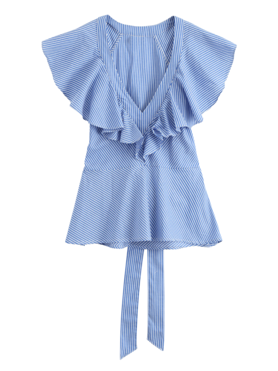This stylish blue and white striped blouse features a deep V-neckline with delicate ruffle detailing that adds a touch of femininity. The flutter sleeves create a soft, flowy silhouette.
